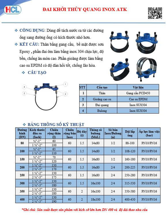 Đai khởi thùy Quang inox hiệu ATK do công ty HCL sản xuất linh hoạt, tiện dụng trong việc lắp đặt, trích nước từ các loại đường ống