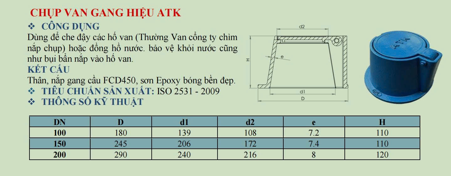 Nắp chụp van gang cầu hiệu ATK cho ống đường kính đến D168 được làm từ gang cầu chắc chắn, bền đẹp, sơn Epoxy trong và ngoài