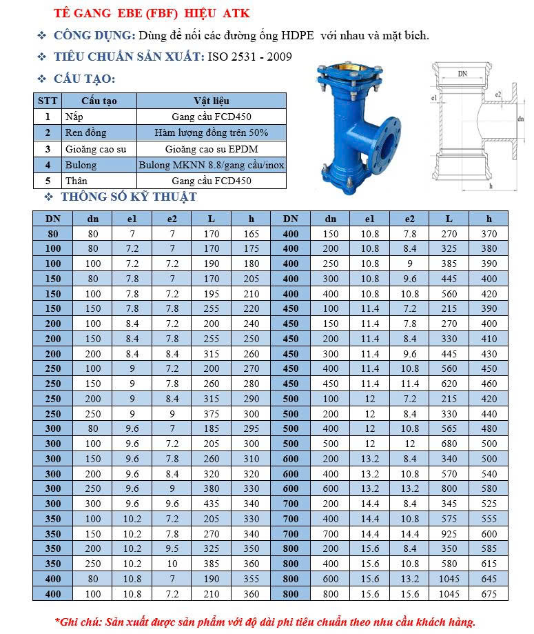 Sản phẩm Tê gang cầu EBE (FBF) gioăng cao su hiệu được sản xuất theo tiêu chuẩn ISO 2531:2009, đảm bảo độ dầy và kích tước tiêu chuẩn, được sơn Epoxy bóng bền đẹp.