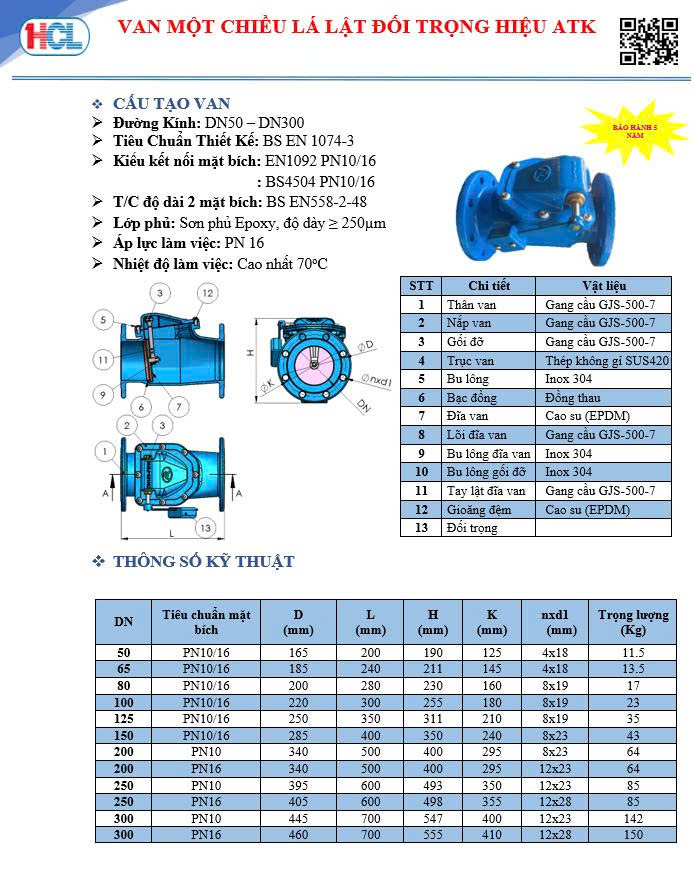 Van một chiều mặt bích đối trọng hiêu ATK do công ty HCL sản xuất nhằm bảo vệ van , đĩa van, tránh va đập đột khi ngắt dòng nước đột ngột